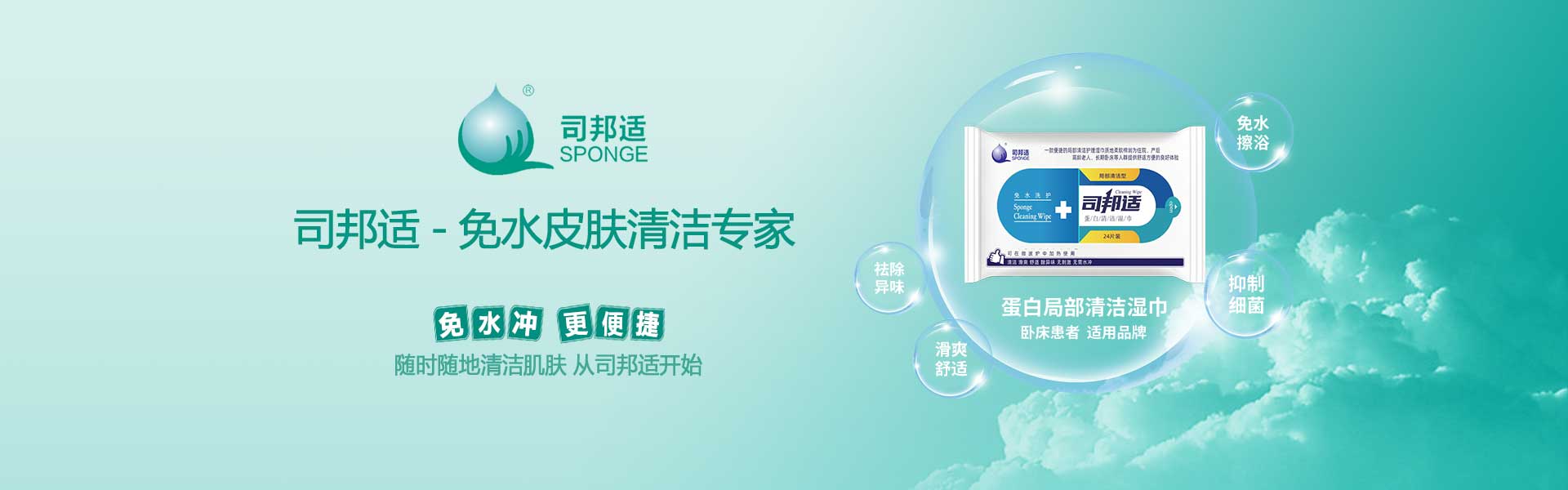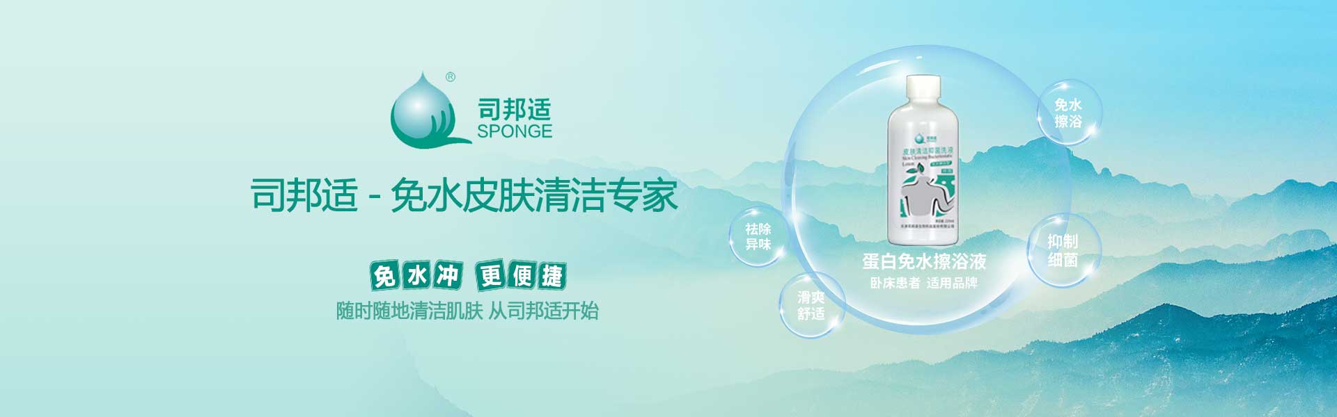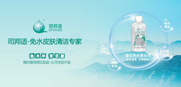 ? ? ? ?本公司研發的司邦適蛋白表面活性因子,不僅對人體皮膚及粘膜沒有刺激,同時具有對皮膚很強的清潔能力;可以祛除人體皮膚上的異味,并且具有較強的抑菌功效。使用后無需用水沖洗皮膚仍感到舒適爽滑;基于上述原因我們研發的司邦適免水清潔系列產品。主要適用于各種主觀或者客觀上不方便全身或局部皮膚清潔的人群。